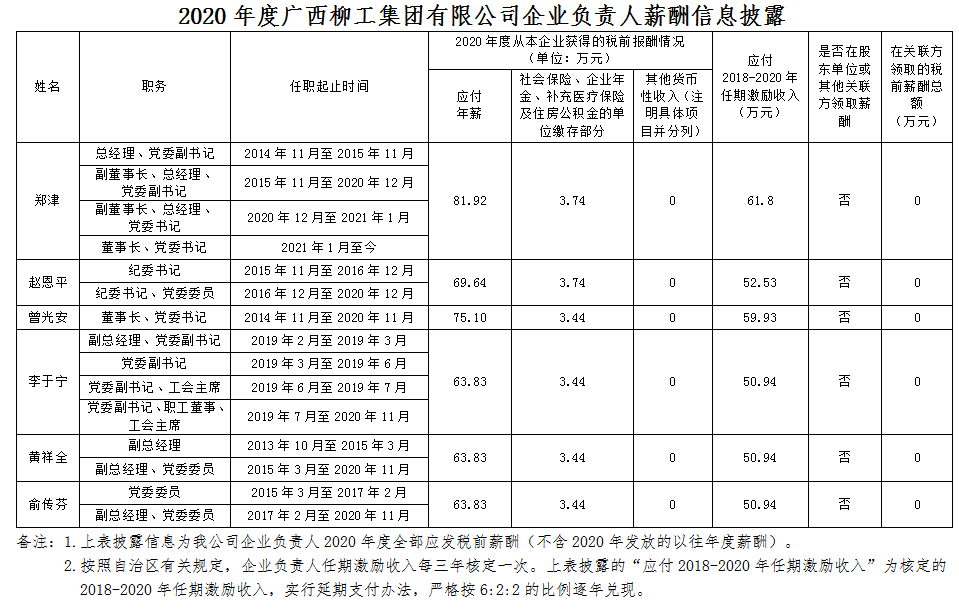 2020年度廣西柳工集團有限公司企業負責人薪酬信息披露