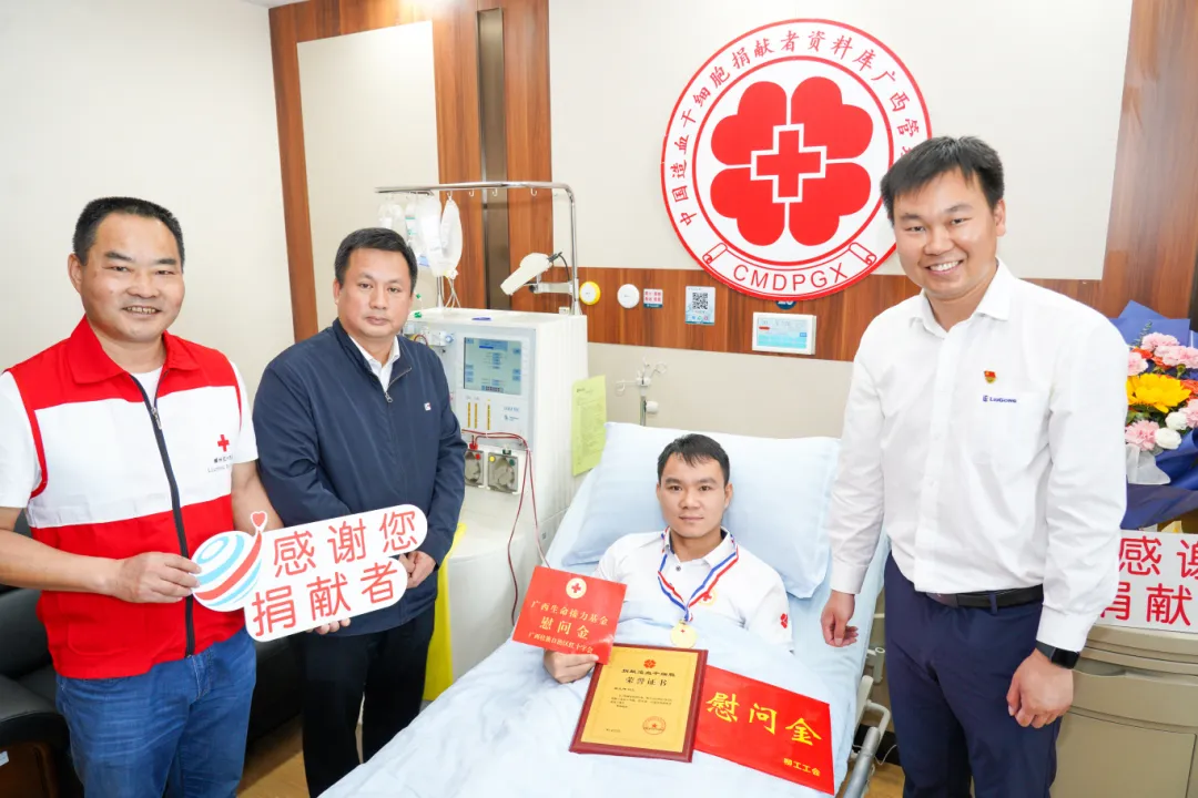 當天上午,柳工工會常務副主席李泳、柳工挖掘機事業部黨委副書記石祺祥與柳州市紅十字會黨組成員、副會長朱政等一同來到采集病房看望吳立偉,為他送去慰問,并頒發中國紅十字總會授予的獎牌和證書。