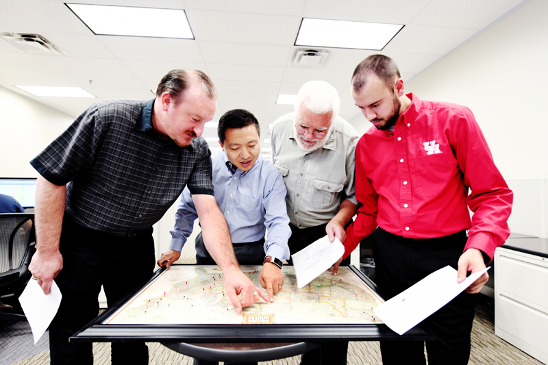 李東春(左二)正在與工作人員交流