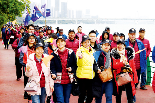 隨著曾光安的一聲啟動(dòng)號(hào)令,23個(gè)基層單位代表隊(duì)整齊有序地從起點(diǎn)出發(fā)。徒步中,天空飄起了蒙蒙細(xì)雨,接近冰凍的天氣讓大家不禁在寒風(fēng)中瑟瑟發(fā)抖,但腳下的步伐卻卻絲毫沒(méi)有減慢,沿著濱水大道邊聊邊走,感受著沿途的美麗風(fēng)景、分享著共同迎接新年的喜悅。“這樣的天氣能有這么多人,很熱鬧,讓人很有干勁。”來(lái)自集司機(jī)關(guān)的董先生說(shuō),“舉辦這次活動(dòng)一方面是讓大家從繁忙的工作生活中釋放出來(lái),強(qiáng)身健體;同時(shí),對(duì)參與者的意志品質(zhì)也是一種鍛煉。”